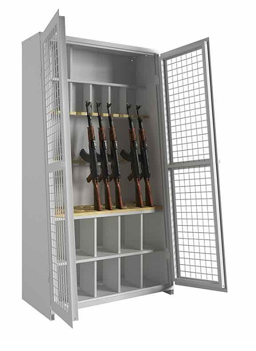 Армейский шкаф серии ШХО-103 пирамида предназначен для хранения различных модификаций автомата Калашникова. Шкаф полностью соответствует приказу Министерства обороны РФ №333. Изготовлен из высококачественной стали толщиной 1,5 мм. Двери выполнены из сварной решетки диаметром 5 мм, полки из фанеры толщиной 20 мм. Дополнительно предусмотрены места для хранения магазинов, штык-ножей, масленок, противогазов и саперных лопаток. Цвет шкафа: серый Ral 7024. Поставляется в сварном виде.