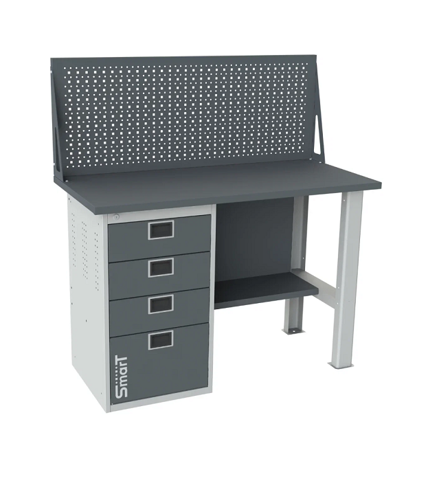 В комплектацию верстака входит: столешница 1280 SMART, полка/стенка 625 SMART, тумба SMART 4, опора SMART, один перфорированный экран SMART. Столешница выполнена из фанеры 27 мм со стальной окрашенной накладкой 1,2 мм. Опора сварная выполненная с применением высокоточного сварочного оборудования. Имеет нижнюю перекладину для усиления устойчивости конструкции. Размер опоры (ВхШхГ): 835х500х135 мм. Тумба SMART-4 комплектуется 4 выдвижными ящиками. Выдвижные ящики оборудованы телескопической системой полного выдвижения ящиков с фиксацией в закрытом состоянии (50000 циклов). Все ящики закрываются центральным ключевым замком. Секретность замка 2000 комбинаций (2 ключа в комплекте). Перфорированный экран SMART имеет универсальную перфорацию (квадрат 10 мм c шагом 38х38 мм и круг 7 мм с шагом 25х38 мм) для размещения различного типа крючков и держателей инструмента. Цвет верстака: опора, корпус тумбы - серый Ral 7035, столешница, полка/стенка, лицевая панель тумбы - графит Ral 7016. Поставляется в разобранном виде.