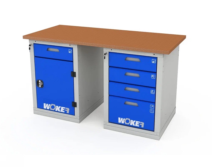 В комплектацию верстака входит: столешница Woker 1500, одна тумба Woker 02, одна тумба Woker 04, полка/стенка Woker. Столешница выполнена из шлифованной березовой многослойной фанеры толщиной 30 мм. Снаружи фанера обработана влагостойким антисептиком цвета "красное дерево", что придает фанере повышенную влагостойкость и более темный цвет. Тумба Woker 02 имеет одну регулируемую по высоте полку (шаг 50 мм). Полка тумбы установлены на стальные салазки, которые позволяют выдвигать полку на себя на 70% для облегчения разгрузки/погрузки. Дверь тумбы закрывается на цилиндрический замок со стальной поворотной ручкой, секретность замка 2000 комбинаций. Открывание двери на 180 градусов. Тумба Woker 04 комплектуется 4 выдвижными ящиками (3 высотой - 135 мм и 1 высотой - 275 мм). Полезный размер ящика: (ШхГ) 459х612 мм. В ящиках есть противоскользящие коврики и набор наклеек с пиктограммами для маркировки содержимого. Полка/стенка выполнена из стального листа толщиной 1 мм. Выдерживает нагрузку -30 кг.