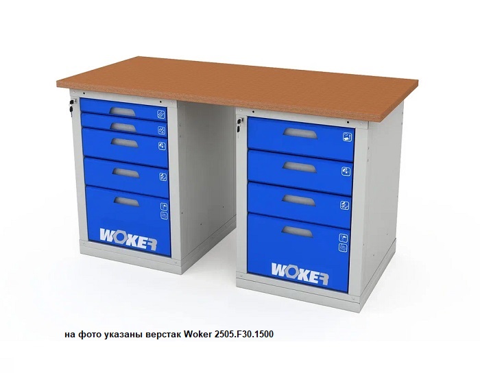 В комплектацию верстака входит: столешница Woker 1500, две тумбы Woker 05. Столешница выполнена из шлифованной березовой многослойной фанеры толщиной 30 мм. Снаружи фанера обработана влагостойким антисептиком цвета "красное дерево", что придает фанере повышенную влагостойкость и более темный цвет. Тумба Woker 05 комплектуется 5 выдвижными ящиками (2 высотой - 135 мм, 2 высотой - 65 мм и 1 высотой - 275 мм). Полезный размер ящика: (ШхГ) 459х612 мм. В ящиках есть противоскользящие коврики и набор наклеек с пиктограммами для маркировки содержимого.