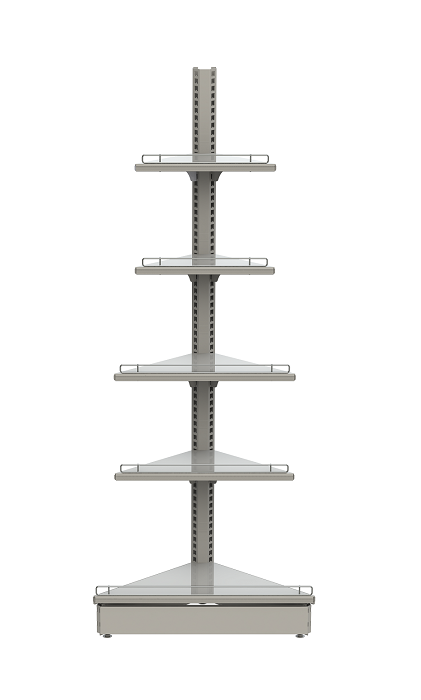Стеллаж сетчатый угла внешнего помогает полностью задействовать торговое пространство и продолжить целостность ряда пристенных стеллажей при наличии поворотов и колонн в торговом помещении. Актуален для большинства продуктовых, бытовых и хозяйственных помещений.